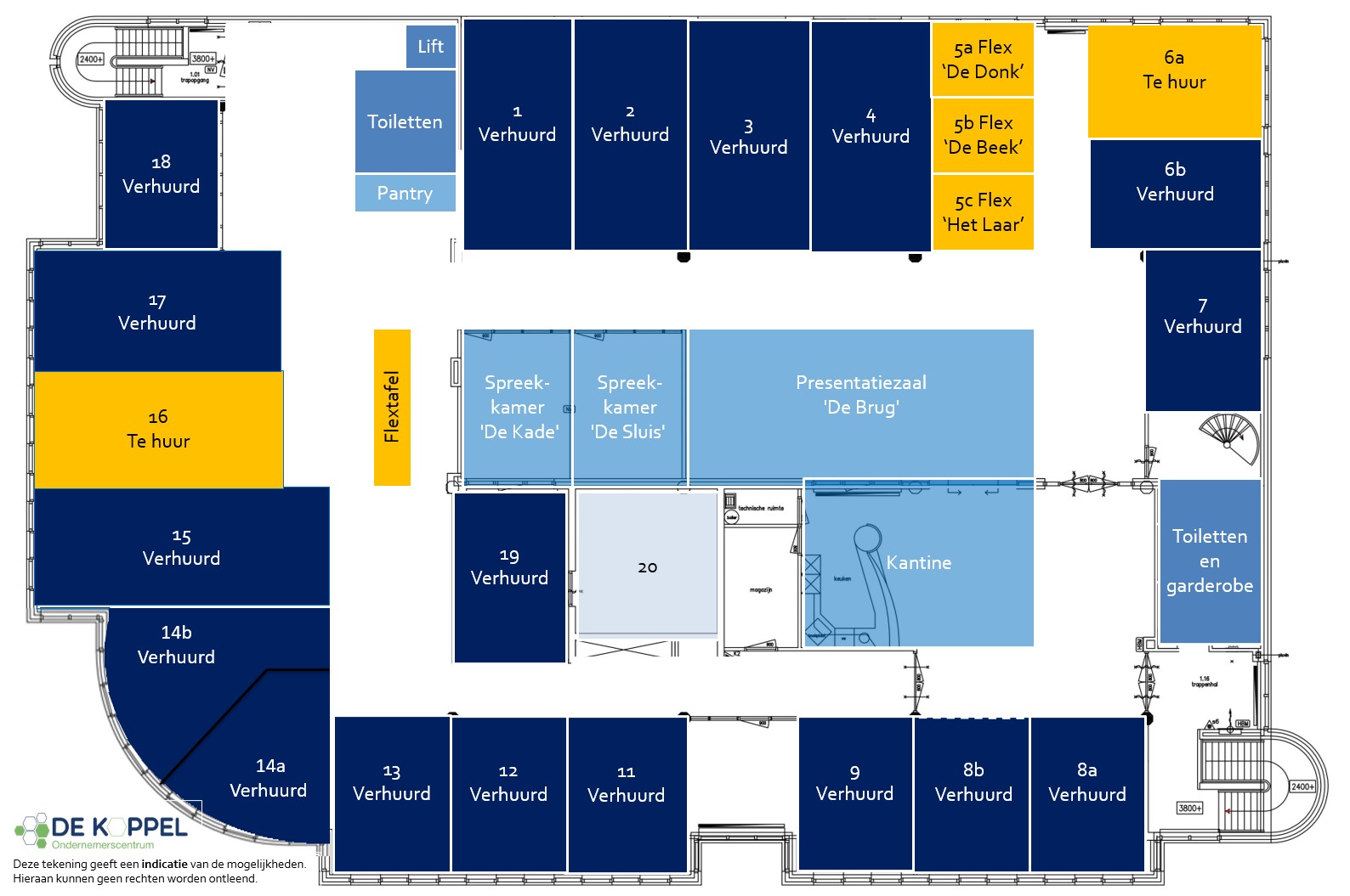 Zoals je op onderstaande plattegrond kunt zien: we zitten al bijna vol. Heb je toch nog wensen om bij ons een ruimte te huren? Neem dan even contact met ons op, dan kijken we of we jouw specifieke wensen kunnen inwilligen.